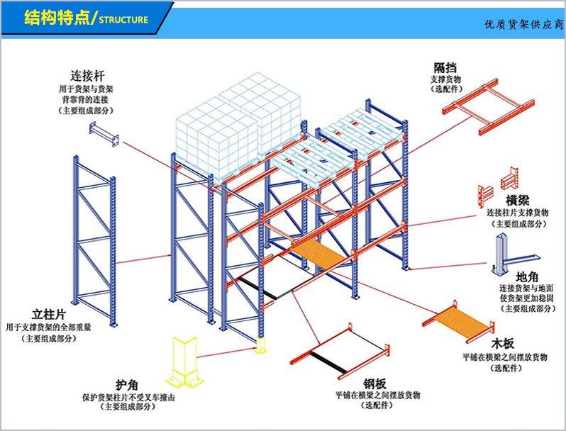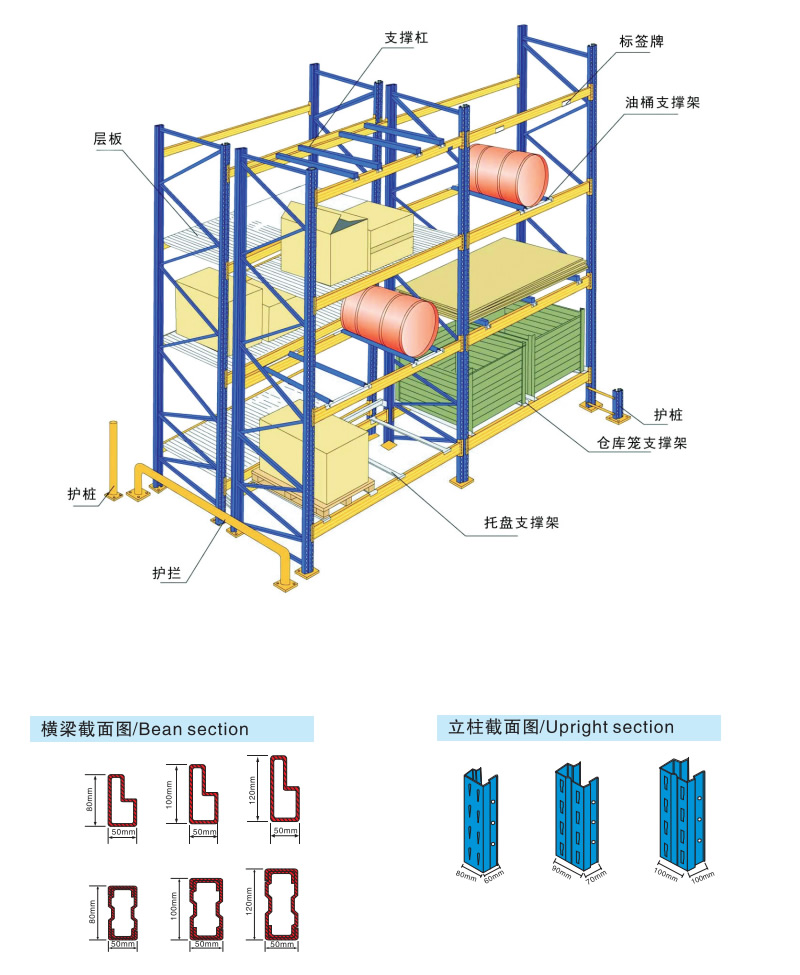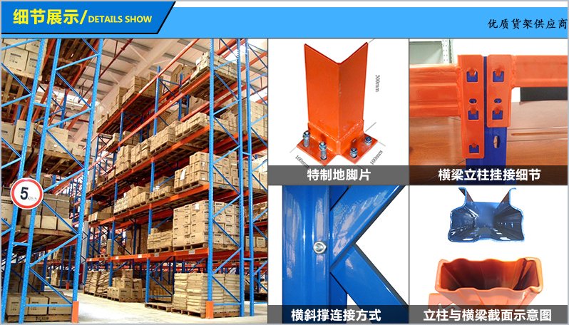 4、可以增加立柱護(hù)腳、防撞桿,防止叉車碰撞;為了層載更安全 還可在橫梁上安置橫梁擱擋、層板、網(wǎng)片跨梁等附屬設(shè)施。
