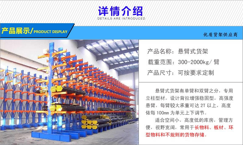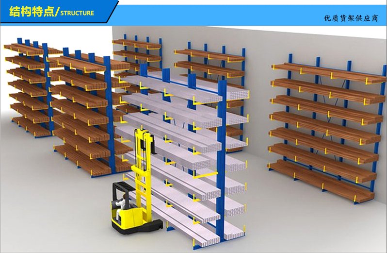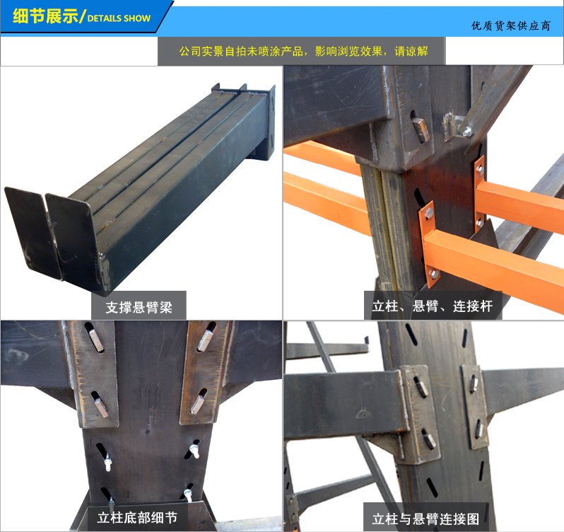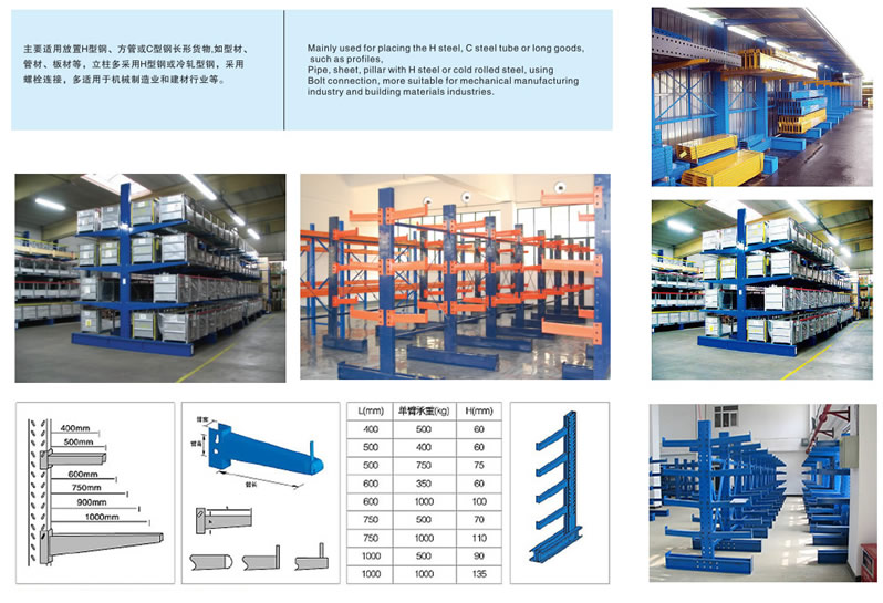 8、懸臂貨架并不是一個獨(dú)立的個體使用的貨架,可以由多個立柱連接來組成一列貨架使用,這樣子每個貨架單元就可以分類儲存不同類別的貨物,高效存儲木料、管材、長條物等類似產(chǎn)品。立柱上面帶有由3-4個懸臂和縱梁相連組成可調(diào)試鉗位夾。